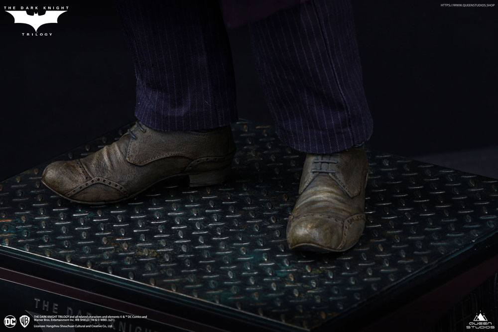 Die Queen Studios 1/4 Joker Statue ist inspiriert von diesem beeindruckenden Charakter aus einer unserer Lieblingsszenen. Die 1/4 Scale Dark Knight Joker Statue fängt Heath Ledgers Darstellung des Jokers ein wie nie zuvor. Für dieses hyper-realistische Kopfporträt konzentrierten sich die Künstler von Queen Studios intensiv auf jedes Detail: von den ausgeprägten Narben seines „Glasgow Grin“ über die tiefen Ausdruckslinien in seiner Stirn bis hin zum ruhigen, aber chaotischen Blick in seinen Augen. Kein Detail wurde ausgelassen.