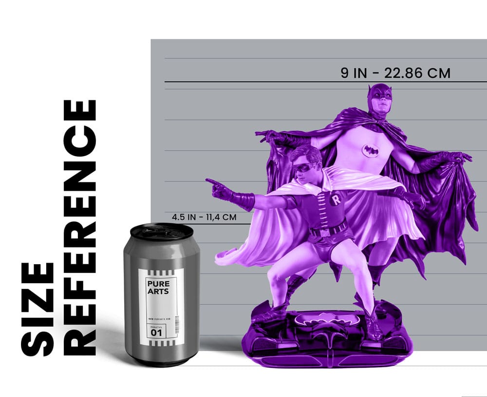 Adam West und Burt Ward als Batman und Robin aus der klassischen Batman-TV-Serie von 1966, jetzt erhältlich als hyper-realistische Diorama-Statue im Maßstab 1/8! Batman & Robin in ihrer ikonischsten Pose, bereit Verbrechen zu bekämpfen und Gotham City zu beschützen, thronend auf einer Nachbildung des ersten Batmobils, das jemals auf der Leinwand zu sehen war.