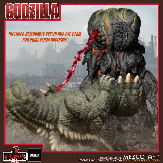 Die 5 Points XL Godzilla vs Hedorah (1971) Boxed Set von Mezco Toyz bringt das epische Duell aus dem klassischen Kaiju-Film direkt zu dir nach Hause! Dieses Set enthält detailreiche Figuren von Godzilla und Hedorah in sowohl finaler als auch fliegender Form. Mit austauschbaren Effekten wie dem Eye Beam FX und nachgebildeten Gebäuden ermöglicht es vielfältige Display-Optionen. Die Figuren bestehen aus hochwertigem Kunststoff und sind in einer sammlerfreundlichen Fensterbox verpackt, die speziell für Sammler entworfen wurde.