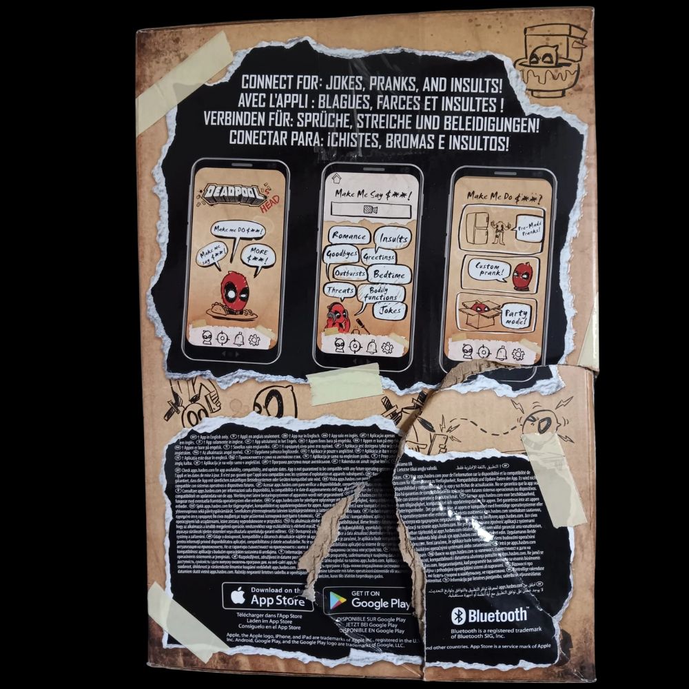 - Besondere Merkmale: über 600 Sounds und Sätze (nur auf Englisch), interaktiv mit Bewegungen und Sensoren, App-optimiert für zusätzliche Funktionen, inspiriert vom Marvel-Charakter Deadpool