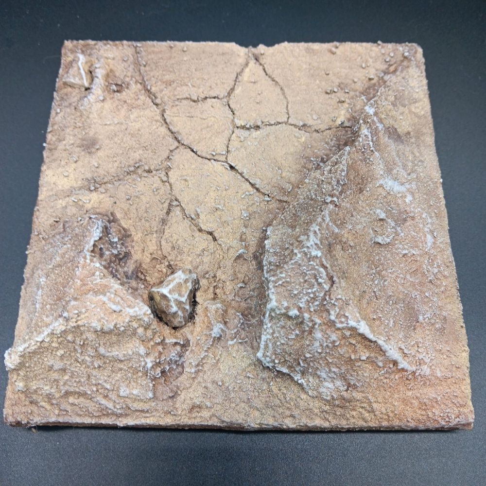 Der stabile Sockel besteht aus einer furnierten Holzplatte, die strukturierte Landschaft darüber ist aus geformtem XPS (Styrodur) gefertigt. Feine Risse im Boden, natürliche Farbabstufungen und angedeutete Felsformationen schaffen eine authentische Kulisse für Figuren-Szenen – ob postapokalyptisch, Sci-Fi oder Wüstenmission.