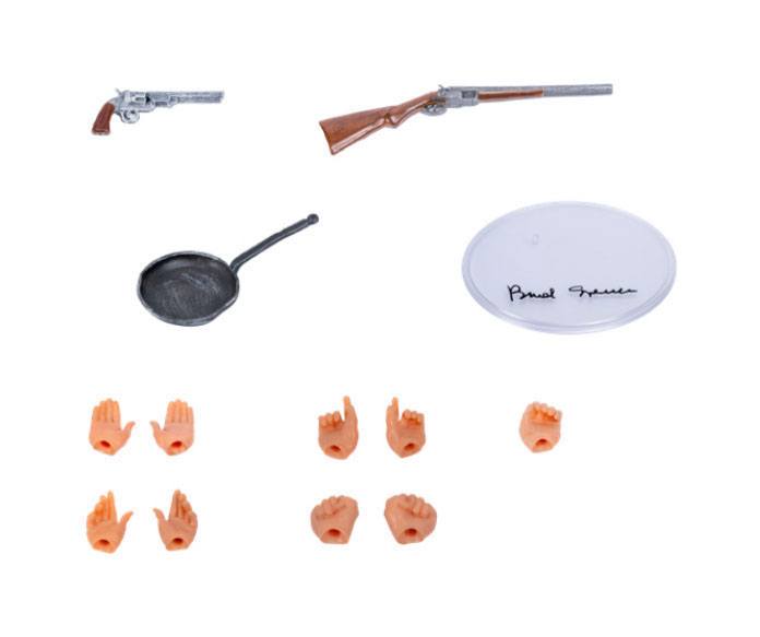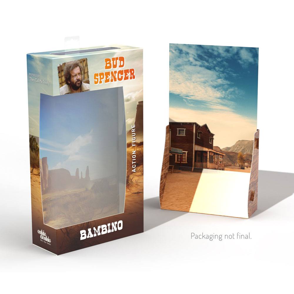 Die offiziell lizenzierte Actionfigur von Bud Spencer wurde inspiriert durch seine Rolle als Bambino ("Der Kleine") aus dem Klassiker "Die rechte und die linke Hand des Teufels". Die 18 cm große Figur verfügt über 14 Bewegungspunkte und wird mit weiterem Zubehör in einer Fensterbox mit Hänger geliefert. Ein transparenter Standfuß mit aufgedruckter Signatur verhilft Bambino zu einem sicheren Stand und ein wendbares, beidseitig bedrucktes Diorama sorgt für eine ansprechende Präsentation der Figur, wahlweise vor Wüsten- oder Westernstadt-Hintergrund.