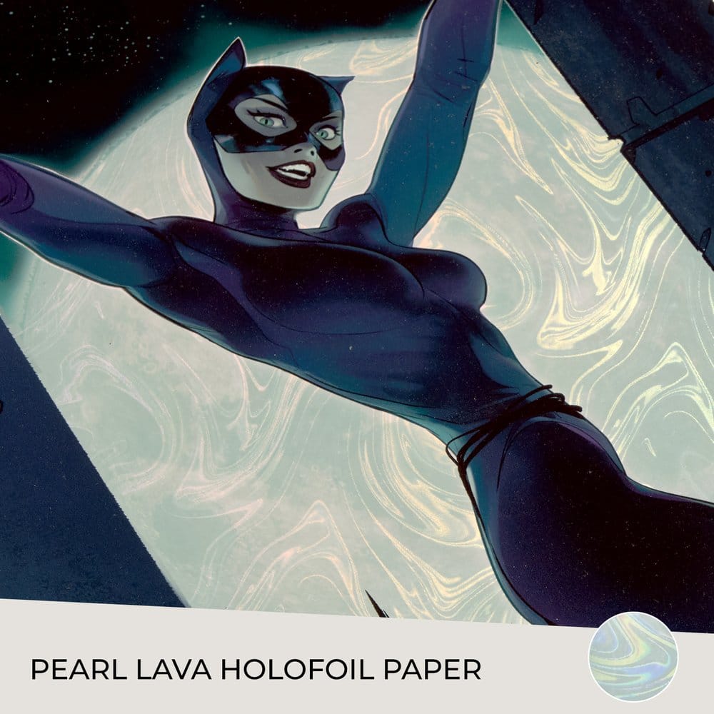 - Besondere Merkmale: offiziell lizenziert; Giclée-Druck mit Epson Archival-Tinte; Perlen-Lava-Hologrammpapier-Display; Heavyweight 100% Baumwollpapier, säurefrei, Archiv-Qualität; geprägtes Echtheits-Siegel; weltweit limitiert auf 150 Stück; ursprünglich Variant-Cover Catwoman #66 (2024)