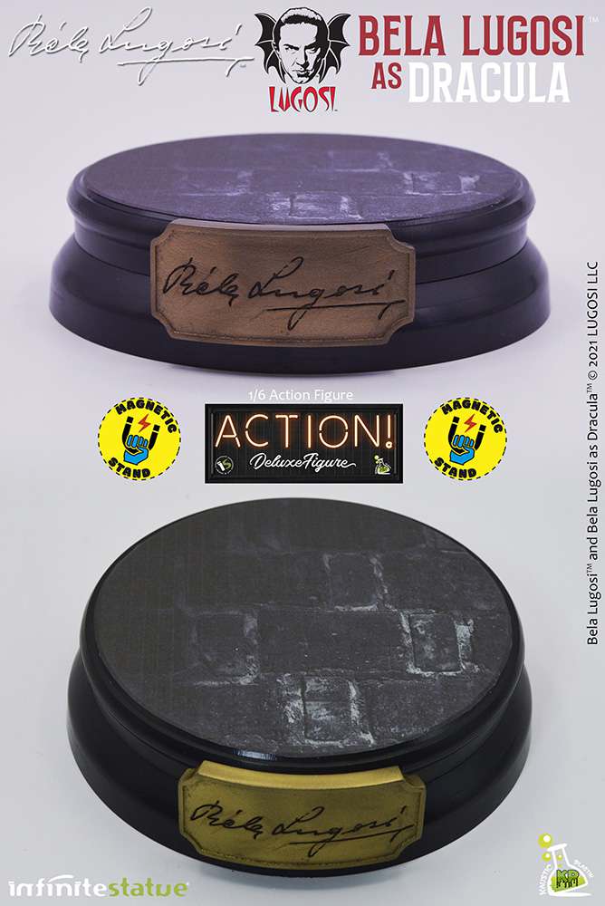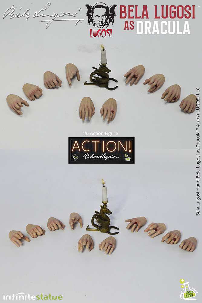 - Besondere Merkmale: zwei realistische Bela Lugosi-Kopfbildnisse (neutraler Ausdruck & grinsend, handbemalt), 10 austauschbare Hände, voll beweglicher Körper, schwarze Stoffkleidung, magnetische Schuhe, magnetischer Standfuß, Drachen-Kerzenständer